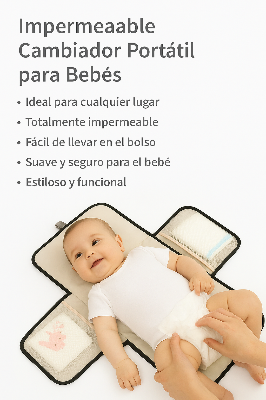 Nuestro cambiador portátil te da la libertad de cambiar a tu bebé en cualquier lugar, de forma higiénica y organizada. Todo lo que necesitas en un solo lugar: pañales, toallitas y ropa siempre a mano. Compacto, fácil de llevar y súper práctico para mamás