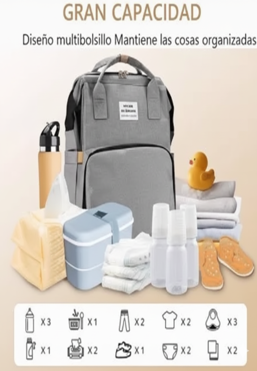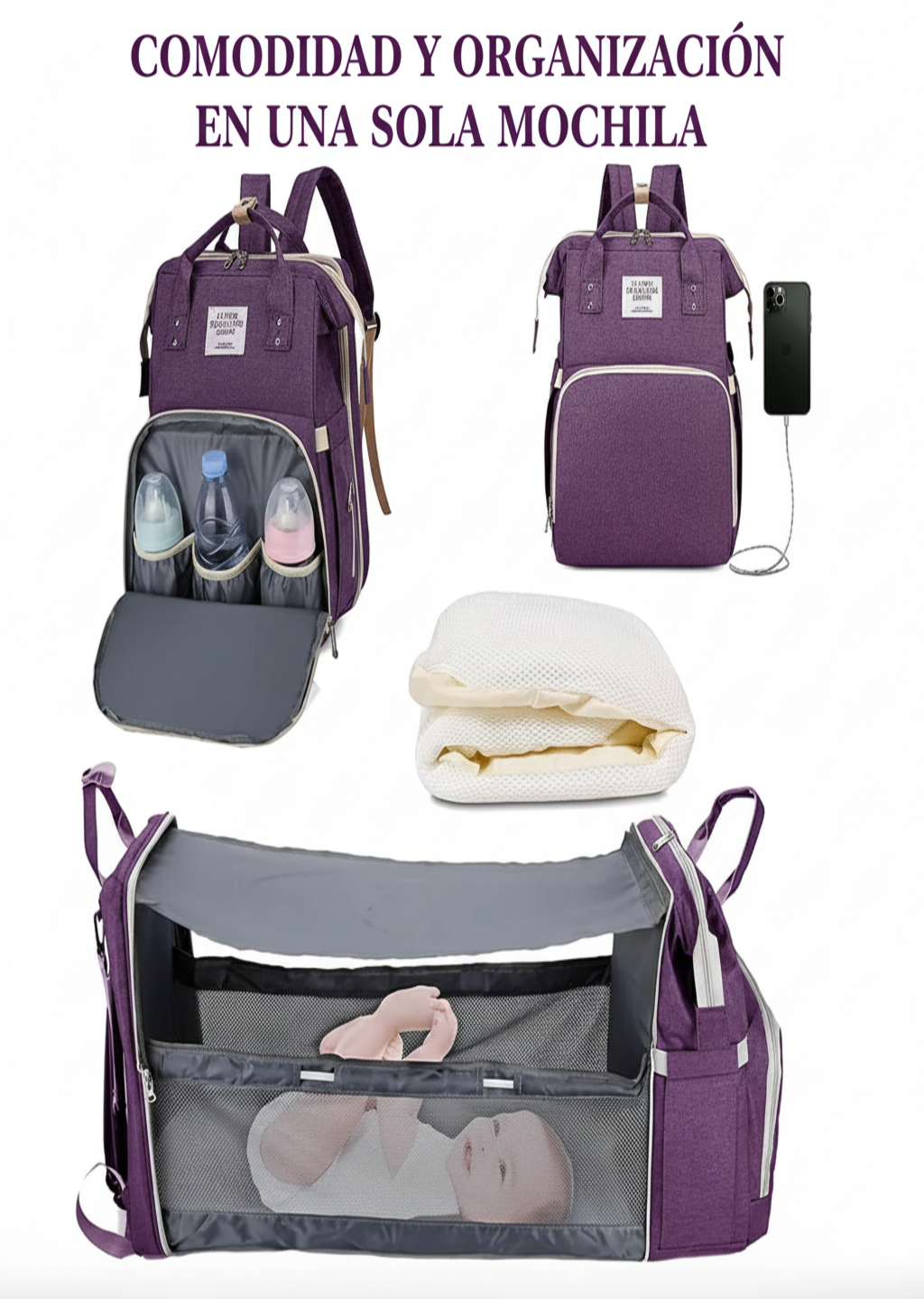 La Mochila 3 en 1 incluye cuna portátil plegable, cambiador, colchón desmontable y varios compartimentos amplios (incluyendo bolsillos térmicos para biberones). Todo lo que necesitas para tus salidas con el bebé, en un solo producto.